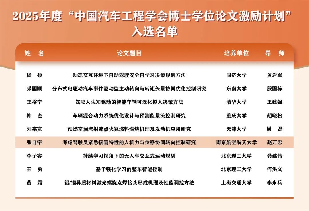 近日,在中国汽车工程学会2025年度“博士学位论文激励计划”的评选中,我院张自宇博士的学位论文“考虑驾驶员紧急接管特性的人机力与位移协同转向控制研究”成功入选,论文指导教师为赵万忠教授、王春燕教授。本次入选,是学校、学院首次斩获该学会优秀博士学位论文正式奖。