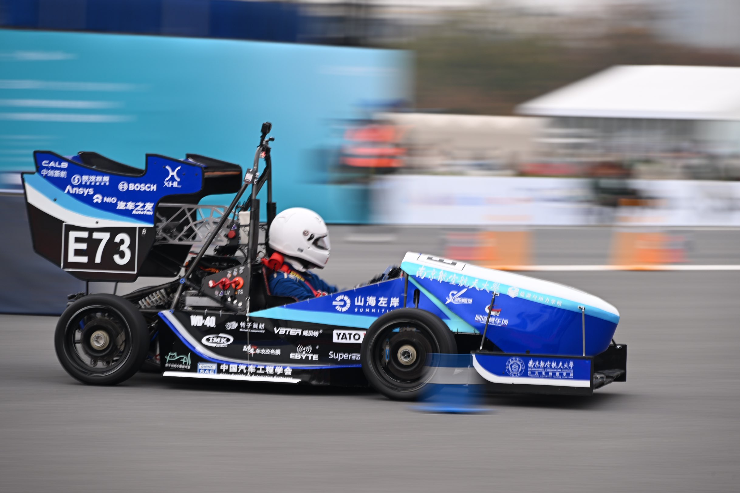 本次参赛的NAV-25赛车由南航领航车队自主设计制造,是一台小型单座电动方程式赛车。比赛期间,队员们沉着应对,积极沟通,高效排除故障,克服电机两侧包裹不完全、电机控制器故障和程序烧录器异常等突发故障,最终顺利完赛。